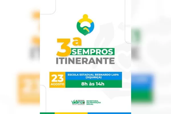 A comunidade do Jiquiriçá, em Valença, vai receber neste sábado (23) uma série de serviços gratuitos ofertados pela Prefeitura Municipal, através da Secretaria de Promoção Social. A ação acontece das 8h às 14h, no Colégio Bernardo Lapa, e integra a 3ª edição da SEMPROS Itinerante, programa que leva atendimentos diretos aos bairros e distritos do município.