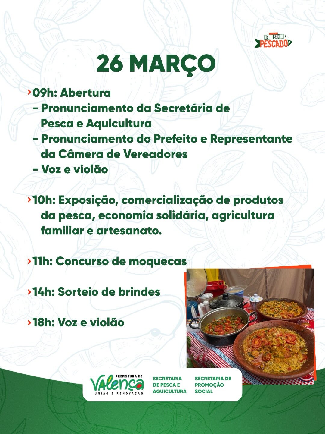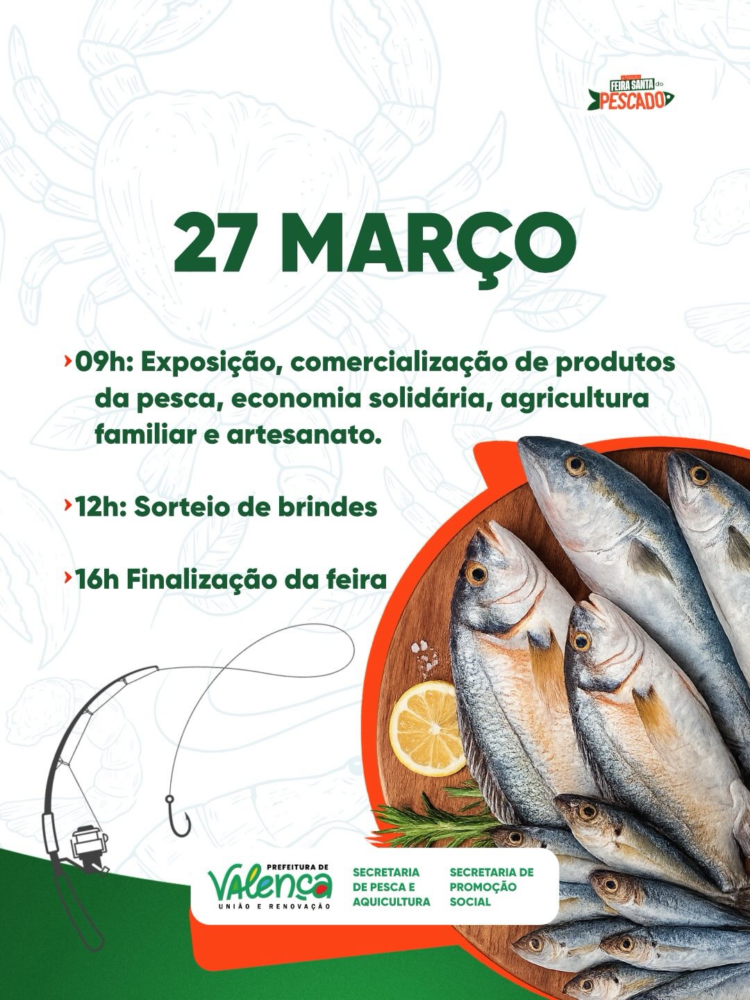 A Feira Santa do Pescado é realizada pela Prefeitura de Valença, por meio da Secretaria de Pesca e Aquicultura e da Secretaria de Promoção Social.
