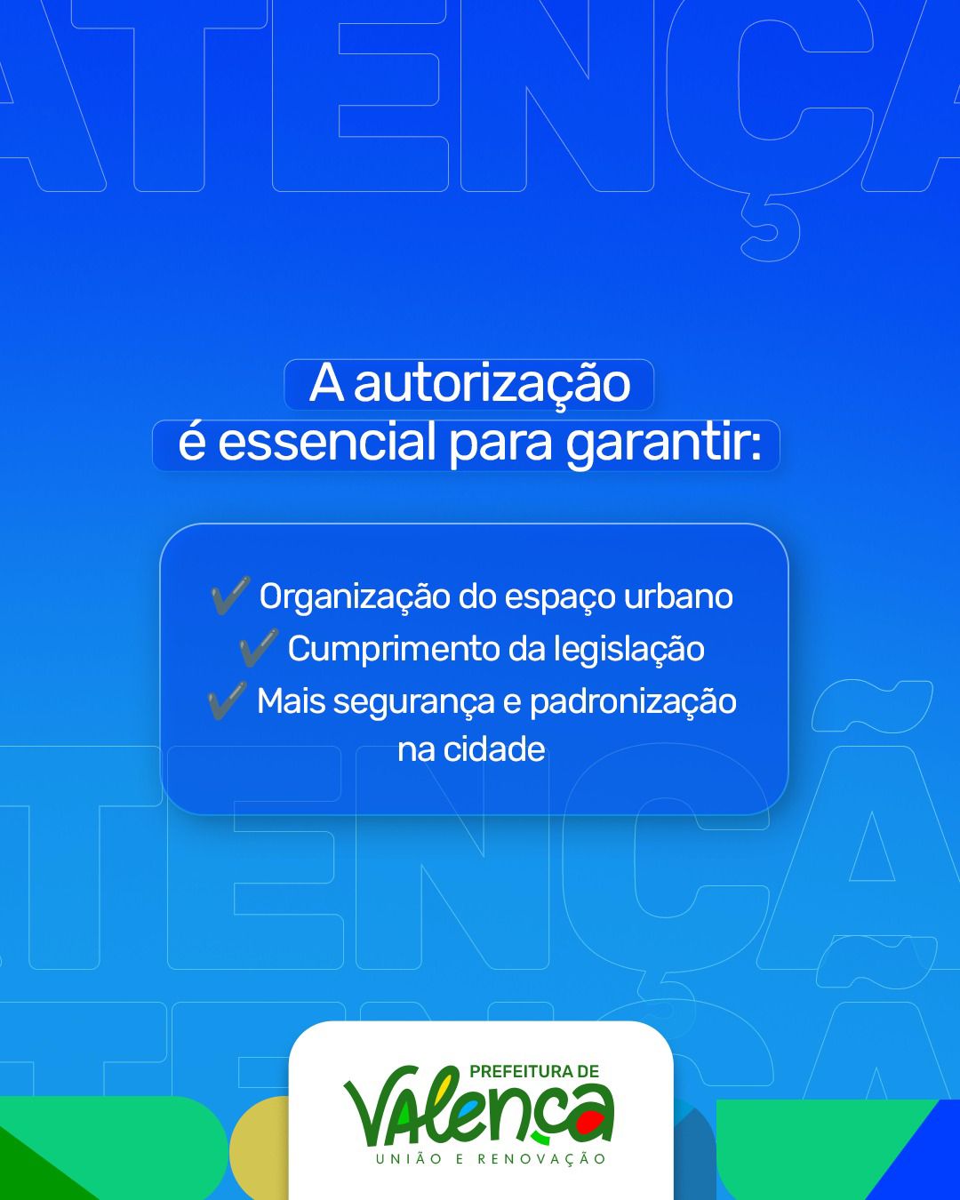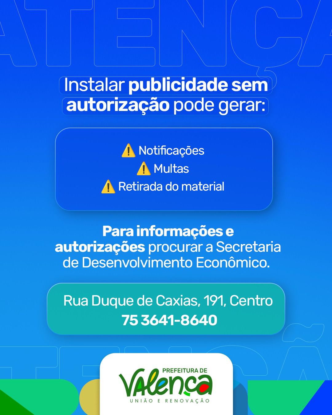 Além de evitar multas e a retirada do material irregular, a autorização e regularização da publicidade contribui para uma cidade mais organizada, segura e visualmente harmônica. Ao cumprir as normas, cada cidadão e empreendedor colabora diretamente para o cuidado com Valença e para a construção de um ambiente urbano melhor para todos.